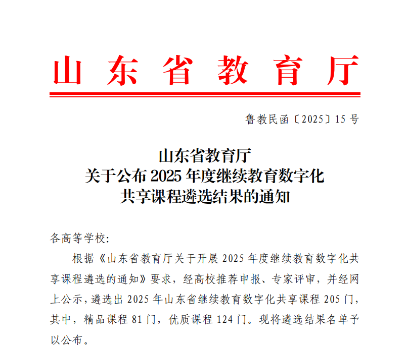 近日,经山东省教育厅严格评审与公示,我院推荐的《民航概论》、《现代礼仪与安身立德》获2025年度省级继续教育数字化共享精品课程,《税务实操》获2025年度省级继续教育数字化共享优质课程,此次获评标志着继续教育学院数字化课程建设再结硕果。截至目前,我院累计获评省级继续教育数字化共享精品课程7门、优质课程11门。