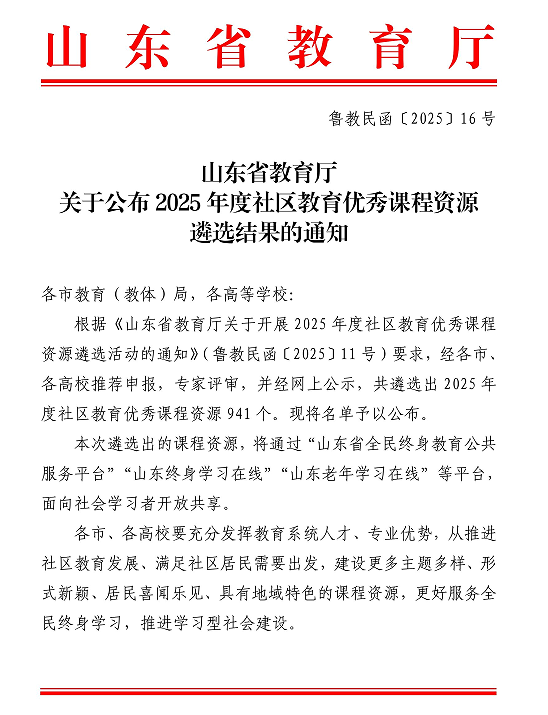 近日,山东省教育厅公布了2025年度社区教育优秀课程资源遴选结果,我校共有6门课程成功入选。这一成果展现了我校在继续教育教学资源开发方面的雄厚实力,也为服务地方学习型社会建设贡献了力量。