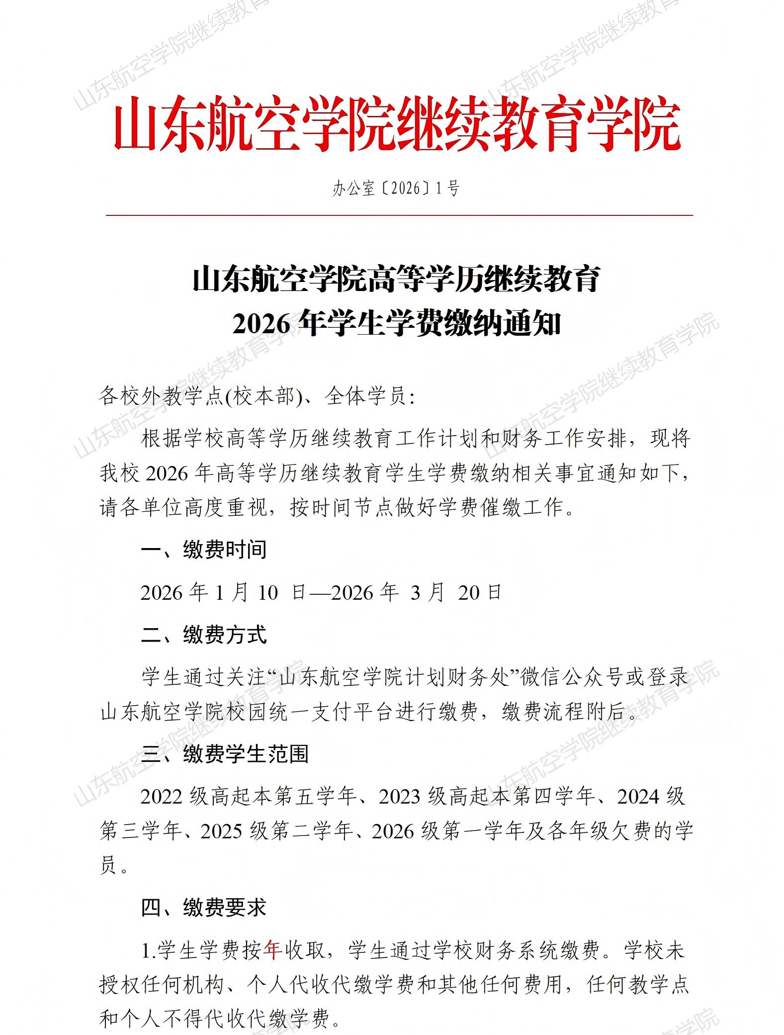 山东航空学院高等学历继续教育2026年学生学费缴纳通知