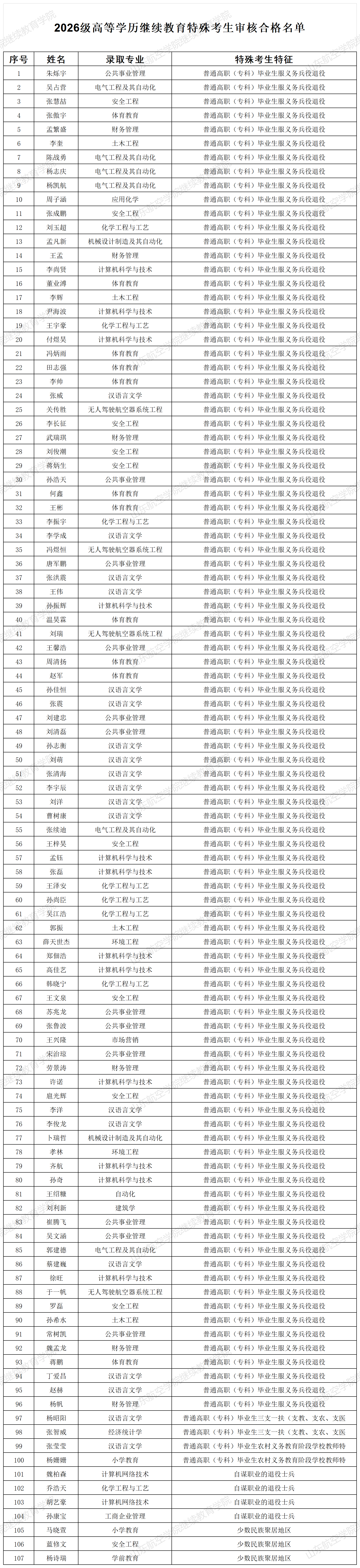 在全部117名特殊考生中,有10名学生因申请退学,未能提交证明材料。经审核确认,其余107名特殊考生所提交的证明材料均真实有效、符合相关规定,现面向社会予以公示。